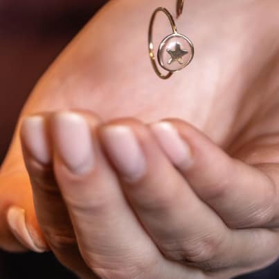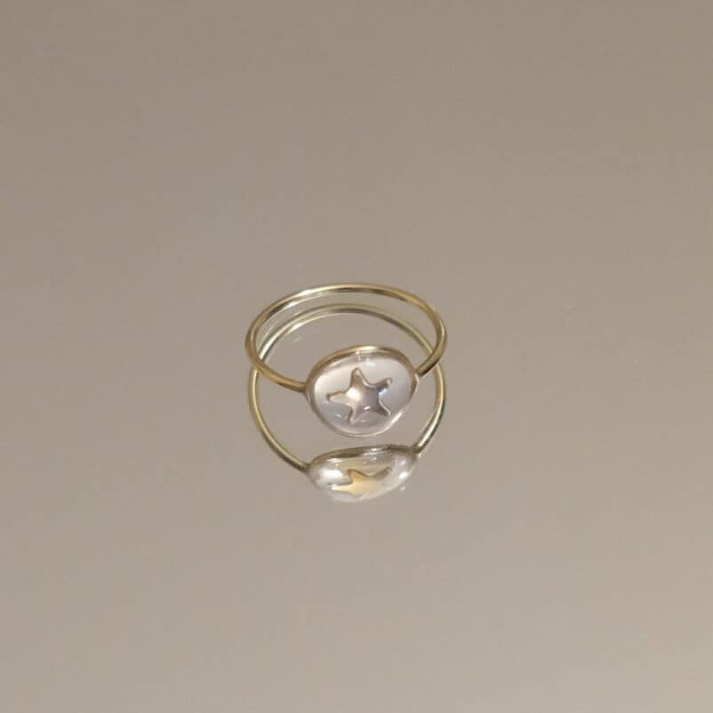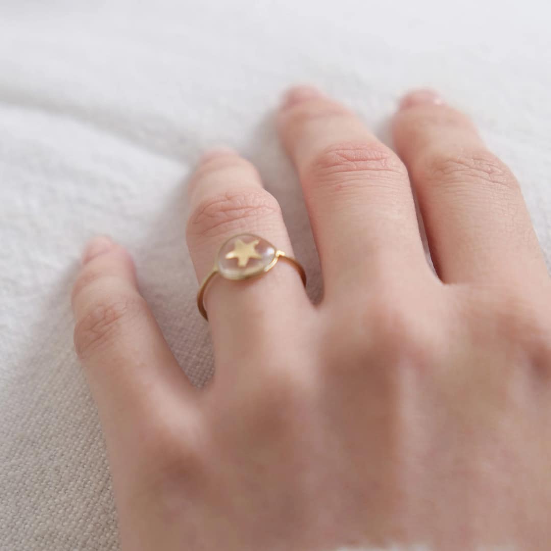 Les étoiles sont des symboles de rêve, de mystère et de beauté céleste. Cette bague arbore une étoile en résine transparente, mettant en valeur la clarté et la pureté de ce symbole céleste.