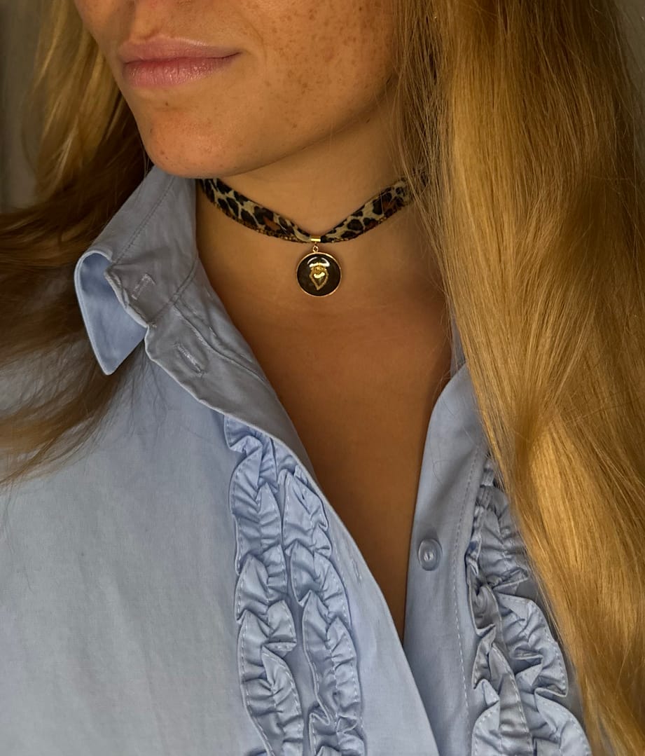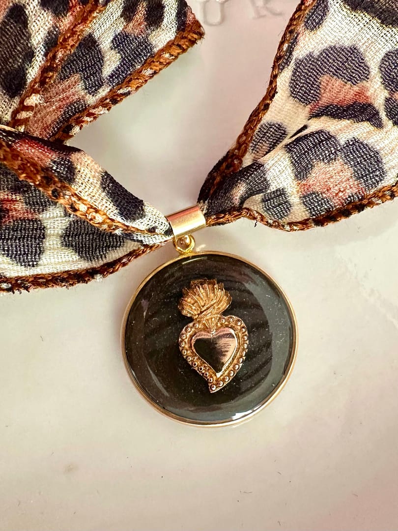 Une Breloquines de taille moyenne au fond noir irisé orné d’un ex-voto en plaqué or vient se glisser sur un délicat ruban de soie léopard.