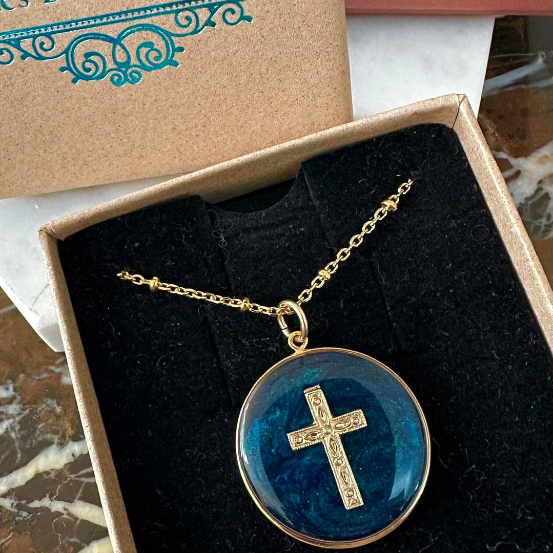 Découvrez notre Médaille Croix en Résine bleue nacrée, une pièce unique qui célèbre la symbolique de la croix dans une élégante résine irisée. Chaque médaille est une œuvre d’art, façonnée avec soin.