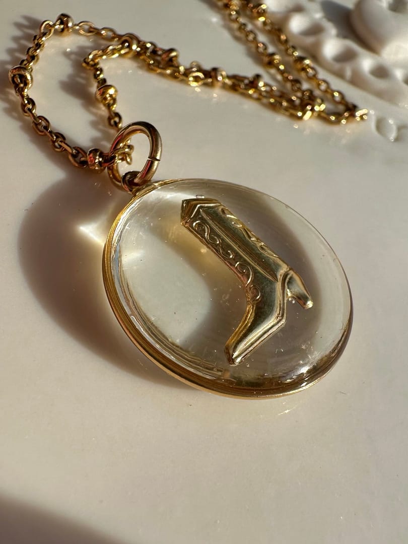 Une médaille tout en transparence et une inclusion Santiag pour l’originalité, mais toujours en gold filled, pour le côté précieux .