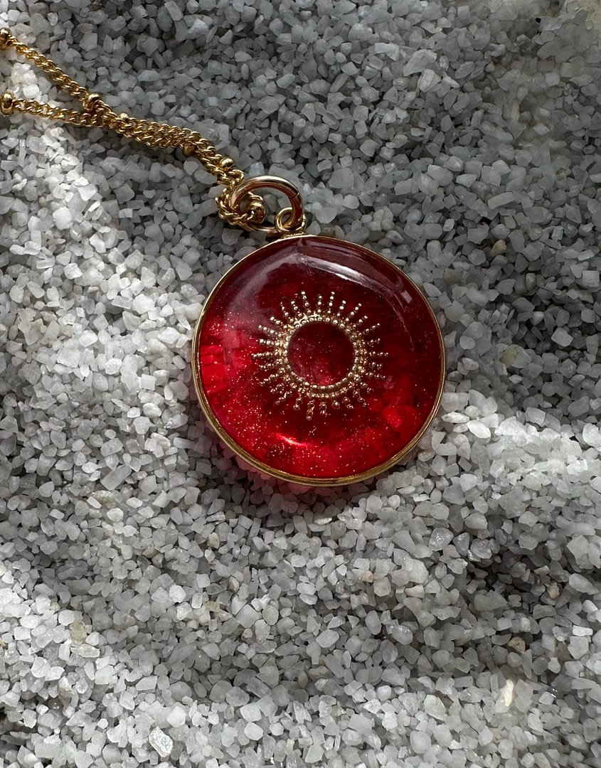 Les astres et les étoiles sont des symboles de mystère, de l’infini et de la beauté céleste. Cette médaille capture la forme d’un astre tout en utilisant une résine rouge, évoquant la vitalité et la passion.