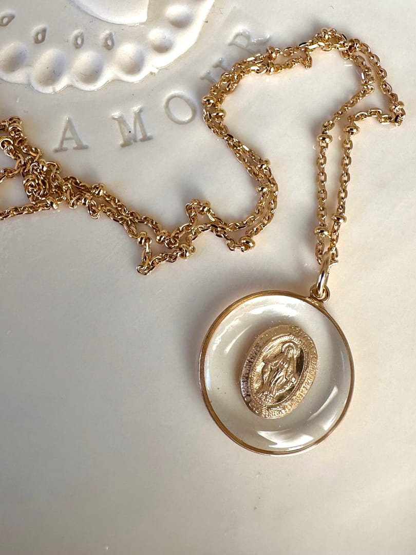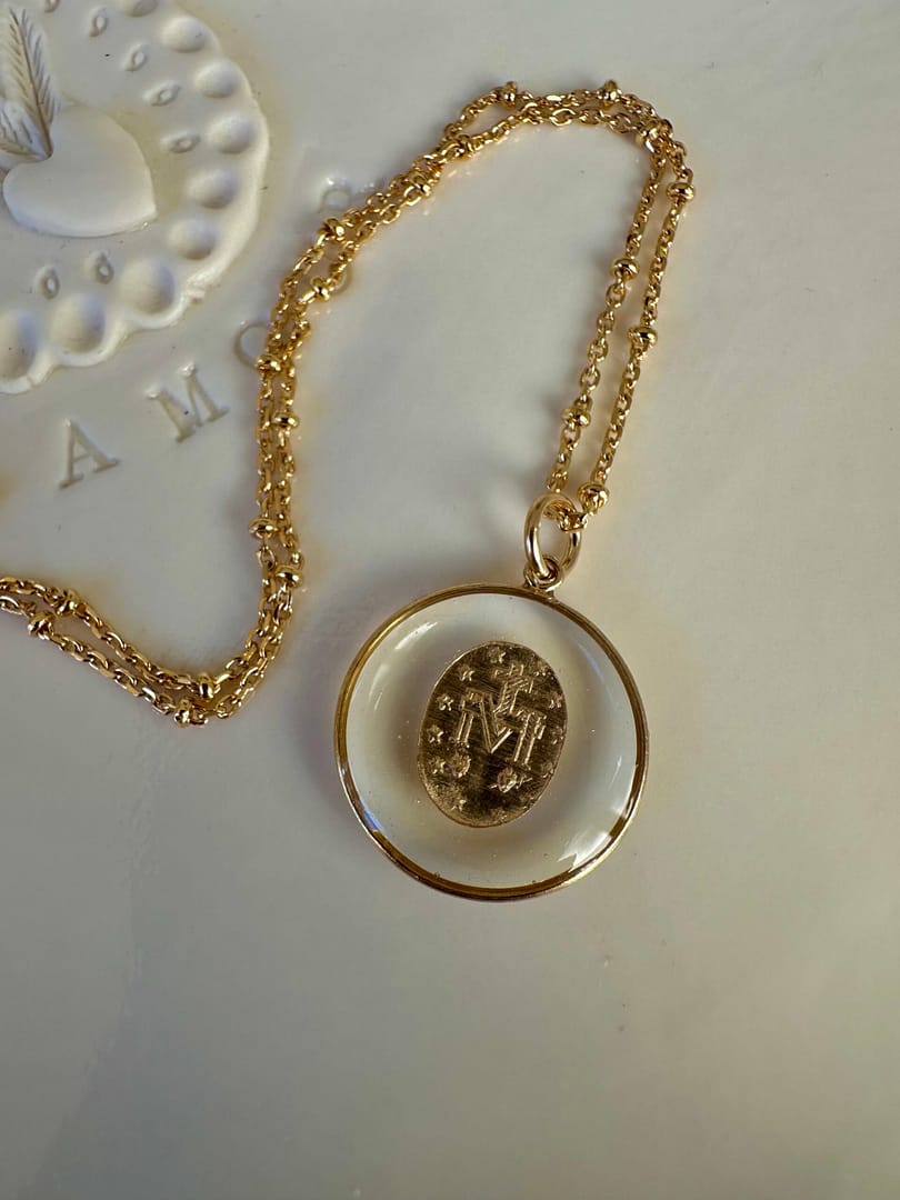 La traditionnelle vierge miraculeuse dans une Breloquines ! Enfermée dans une bulle de résine transparente elle garde son recto-verso et toute sa singularité.