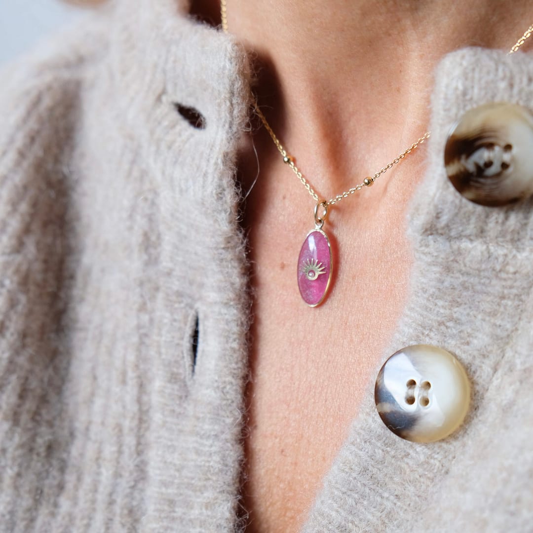 Découvrez notre Médaille Ovale Oeil en Résine Rose Sertie d’une Perle, une pièce unique qui évoque le symbole de la vigilance et la délicatesse de la perle. Chaque médaille est une œuvre d’art, façonnée avec soin pour évoquer la beauté et la rareté de la perle.