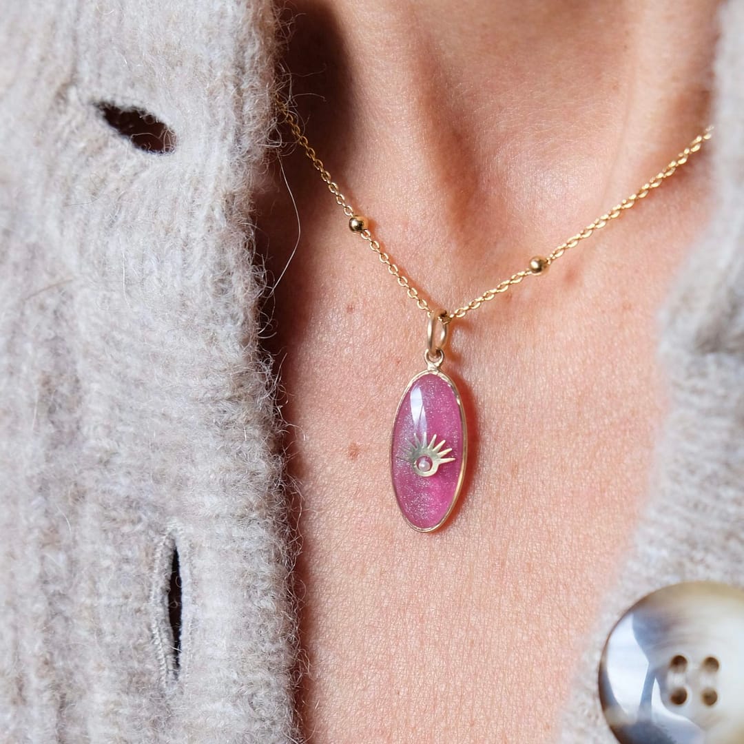 - MATIÈRES : Gold Filled, Résine ( ( Les couleurs de chaque médaillon sont réalisées à la main par le mélange de 3 à 6 pigments différents, ce qui rend chaque Breloquine tout à fait singulière ), micro perles, perles fines, grenats, diamants. ( Certaines gemmes précieuses proviennent de bijoux anciens aussi cela rend certaines Breloquines uniques et non reproductibles )