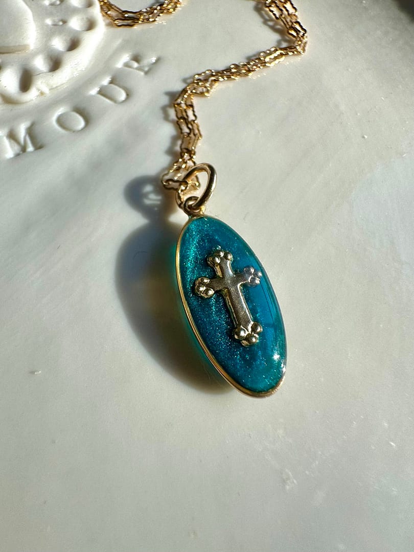 La croix est un symbole sacré associé à la spiritualité. Cette médaille capture la forme d’une croix, caractérisée par des ornements complexes et élégants. La résine ultra pigmentée ajoute une touche de couleur à cette pièce, créant ainsi un contraste entre le Gold filled et les reflets bleus profonds.