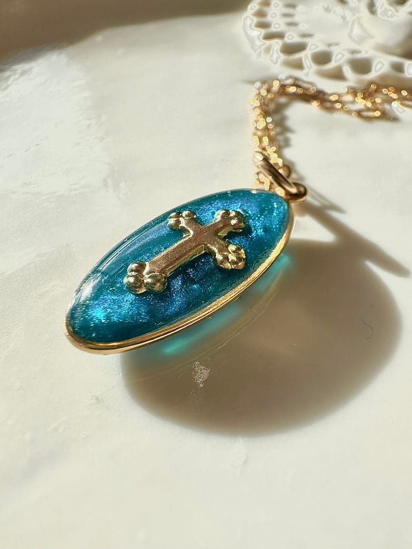 Médaille ovale croix – bleu paon