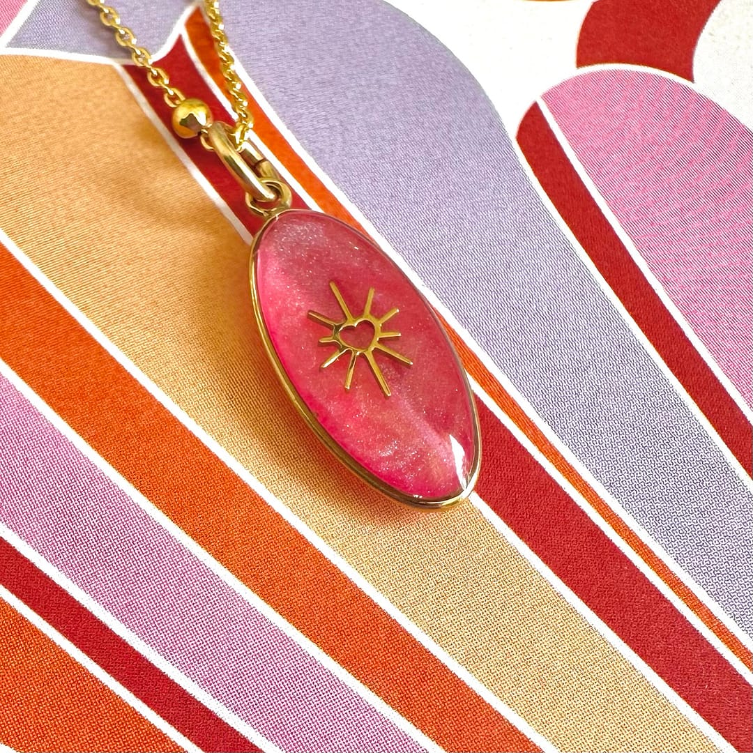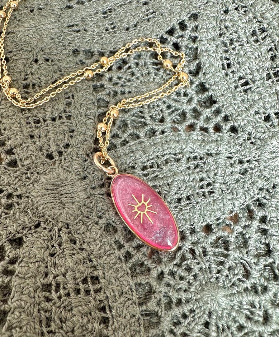 Laisser vous tenter par le charme de cette médaille ovale au fond rose, une couleur qui apporte de la gaieté à toutes les tenues.