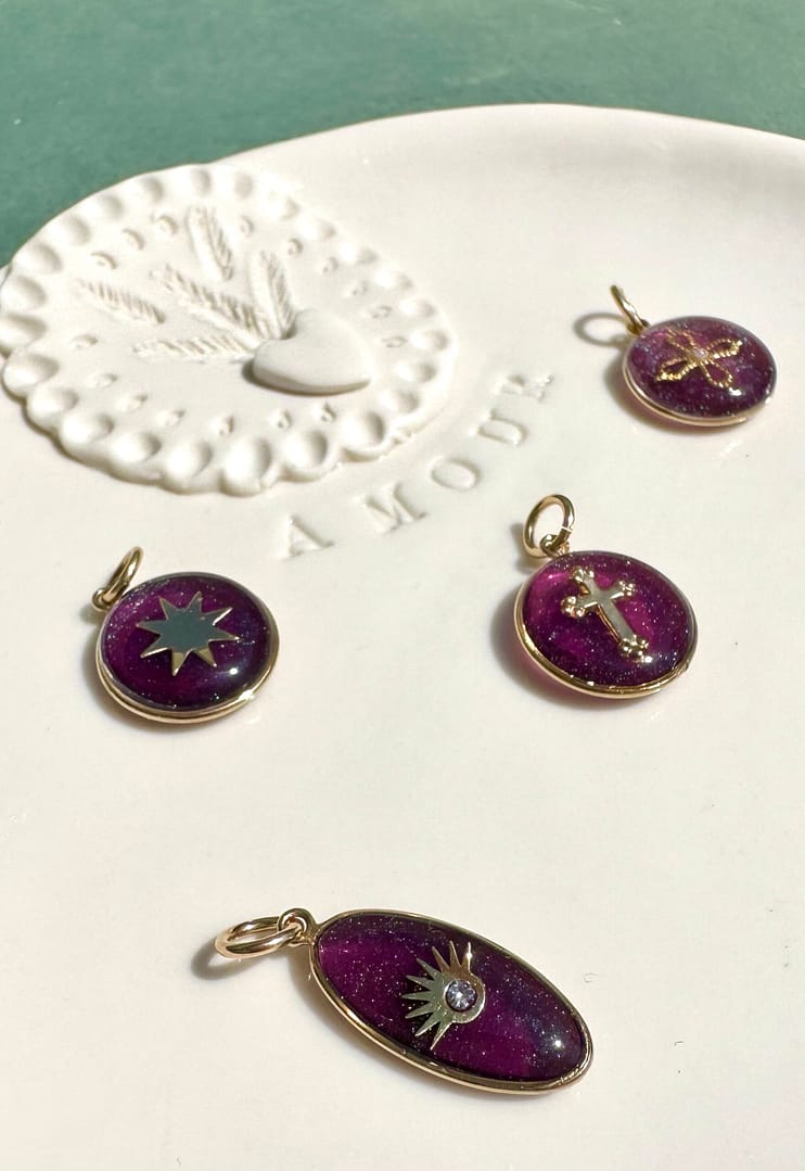 Les couleurs de chaque médaillon sont réalisées à la main par des mélanges de 3 à 6 pigments, ce qui rend chaque Breloquine singulière.