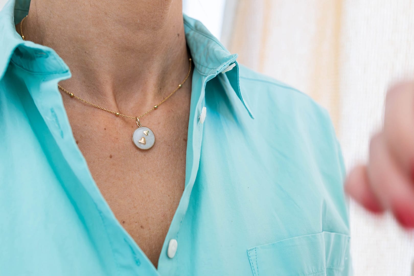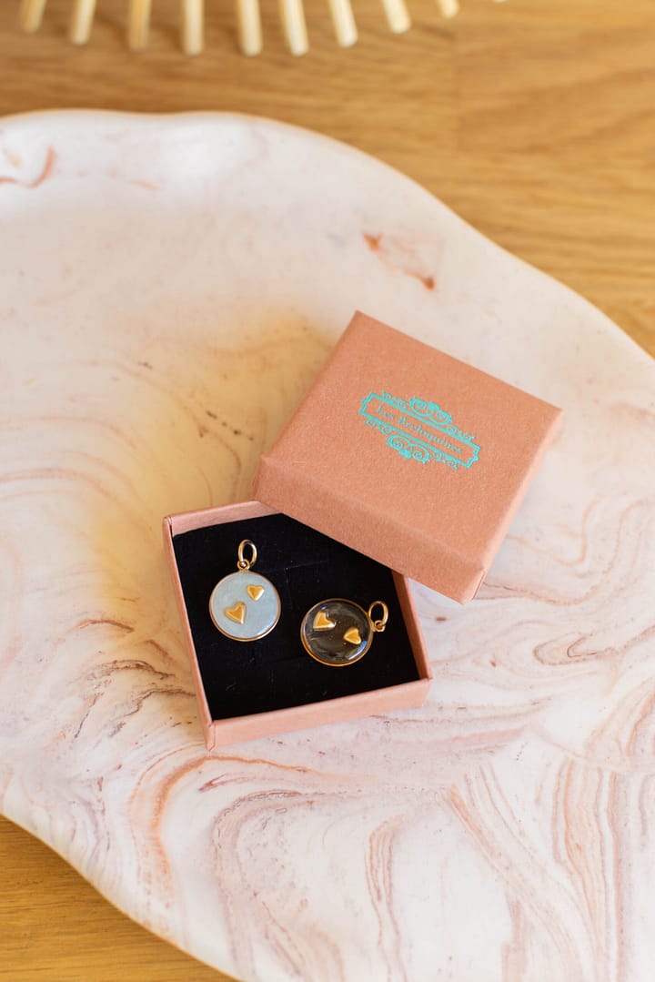 Les couleurs de chaque médaillon sont réalisées à la main par des mélanges de 3 à 6 pigments, ce qui rend chaque Breloquine singulière.