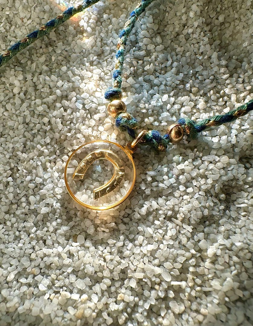 Un gris-gris fer à cheval dans une résine transparente le tout monté sur un cordon tressé dans les tons de kaki, bleu foncé et lurex doré.