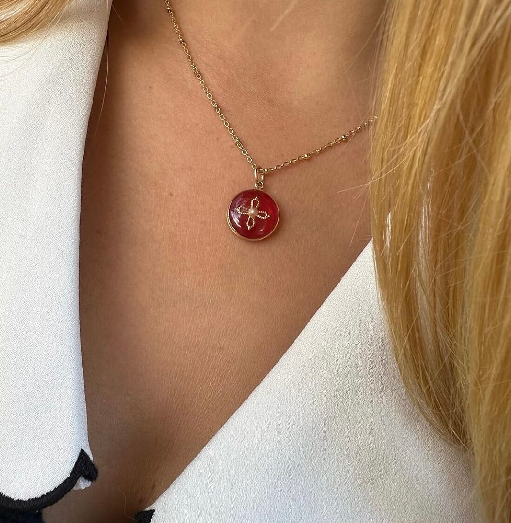 Médaille « S » Croix Romane sertie d’une Perle Fine – Rouge