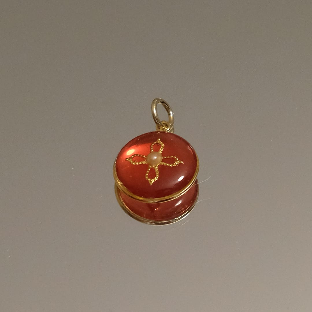 • MATIÈRES : Gold Filled, Résine ( Les couleurs de chaque médaillon sont réalisées à la main par le mélange de 3 à 6 pigments différents, ce qui rend chaque Breloquine tout à fait singulière )micro perles, perles fines, grenats, diamants.( Certaines gemmes précieuses proviennent de bijoux anciens aussi cela rend certaines Breloquines uniques et non reproductibles )